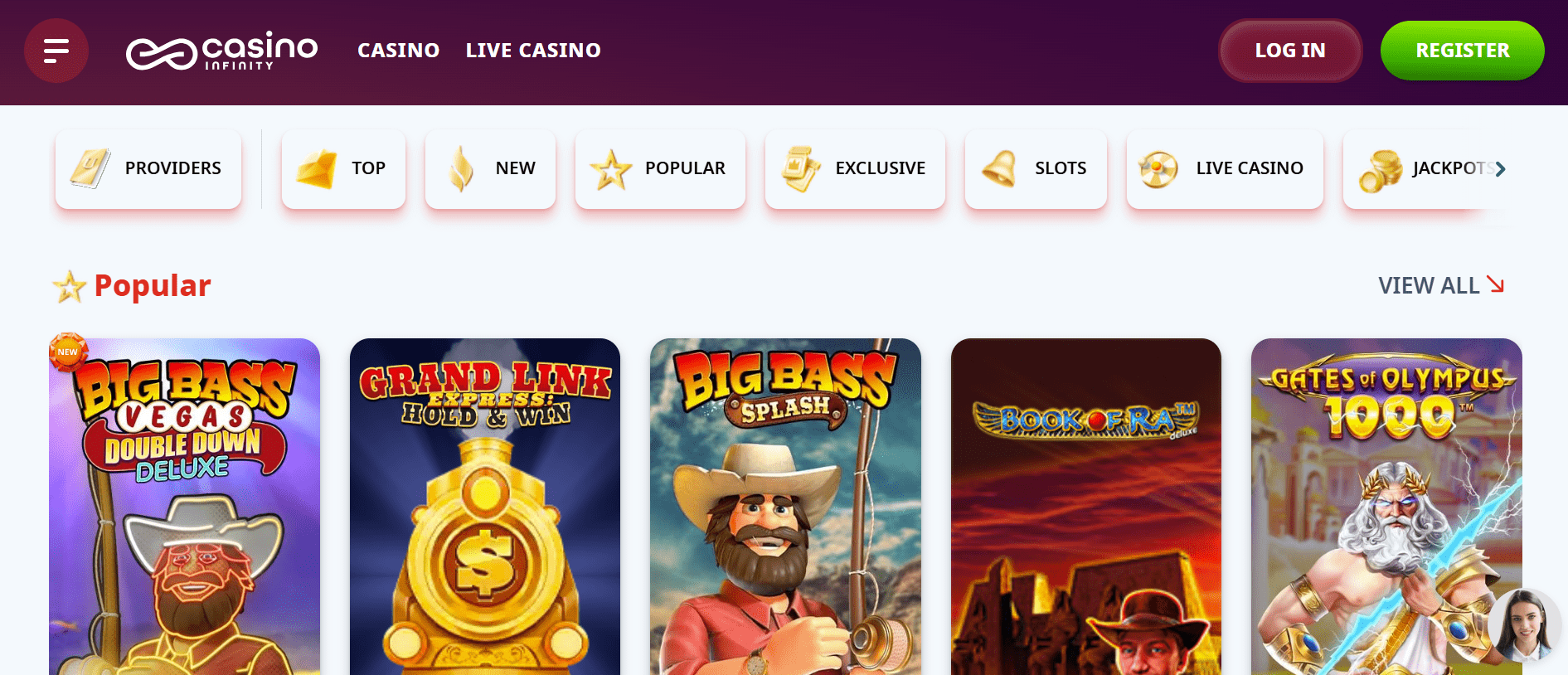 Casino Infinity ist eine Online-Casino-Website mit einer fantastischen Spielauswahl der neuesten und beliebtesten Softwareanbieter. Das Casino ist in mehreren Sprachen verfügbar, die Sie im unteren Bereich auswählen können. Sie können ein Konto von jedem Gerät aus eröffnen, einschließlich der neuesten Web- oder Mobilplattform. Als Mitglied werden Sie Teil des VIP-Programms, in dem Sie VIP-Räume nutzen und zusätzliche Vorteile wie höhere Auszahlungslimits und Online-Casino-Boni, einschließlich Cashback, genießen können. Es gibt auch einen Casino-Shop, in dem Sie Boni kaufen können.