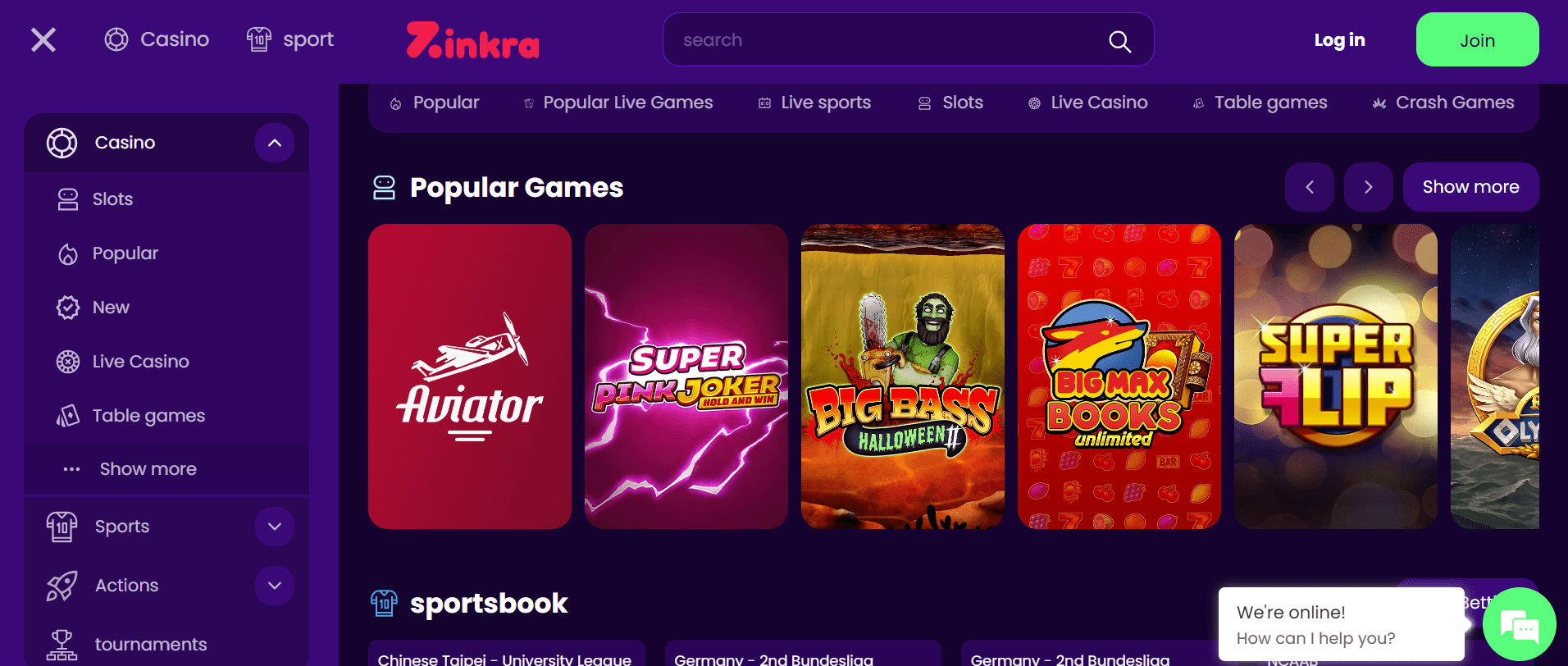 Im Zinkra Casino können Sie zahlreiche Video-, Jackpot- und Megaways-Slots sowie eine große Auswahl an Tisch- und Kartenspielen spielen. Diese werden sowohl virtuell als auch live angeboten und umfassen verschiedene Varianten von Poker, Baccarat, Roulette, Blackjack und mehr.